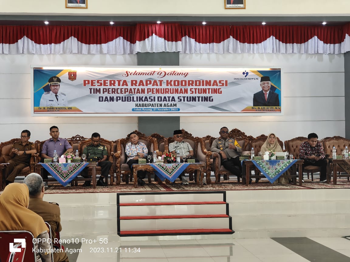 Drs.Edi busti, M.Si yang juga sebagai Wakil ketua TPPS membuka Rapat Koordinasi Tim Percepatan Penurunan Stunting (TPPS) Kabupaten Agam. Kegiatan ini dihadiri oleh Kepala BKKBN Provinsi Sumatera Barat, Dinas Dalduk KB PP dan PA Kabupaten Agam, Dinas Kesehatan Kabupaten Agam, Tim Penggerak PKK, Polres, Penyuluhan Keluarga Berencana (PKB) se Kabupaten Agam, Kepala OPD terkait , Kepala Puskesmas, Camat dan Wali Nagari bertempat di Balerong Rumah Dinas Bupati Agam, Selasa (21/11/2023).