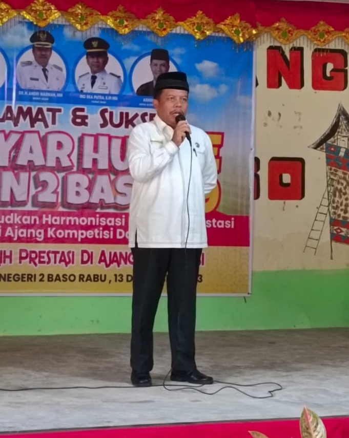 Kadis Pendidikan dan Kebudayaan Kabupaten Agam, Drs. Isra, M.Pd menyampaikan apresiasi yang tinggi atas usaha dan kerja keras Kepala Sekolah, guru- guru, Komite dan para alumni dalam melaksanakan Gebyar HUT SMPN 2 Baso.