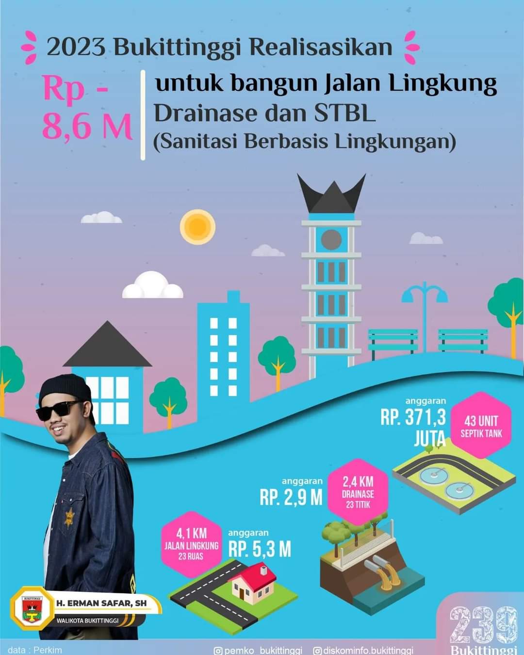 Wali Kota Bukittinggi, Erman Safar, didampingi Kepala Dinas Perkim, Rahmat AE, menjelaskan, untuk membantu kelancaran dan kenyamanan pemukiman warga, Pemko Bukittinggi telah melaksanakan pembangunan jalan lingkungan dan drainase lingkungan yang dilaksanakan sepanjang tahun 2023 dan tersebar di seluruh kelurahan Kota Bukittinggi. Ada 23 ruas jalan lingkungan dengan total panjang 4153,20 meter dan 23 titik drainase lingkungan dengan panjang keseluruhan 2413 meter. Pekerjaan dilaksanakan secara bertahap selama satu tahun terakhir.