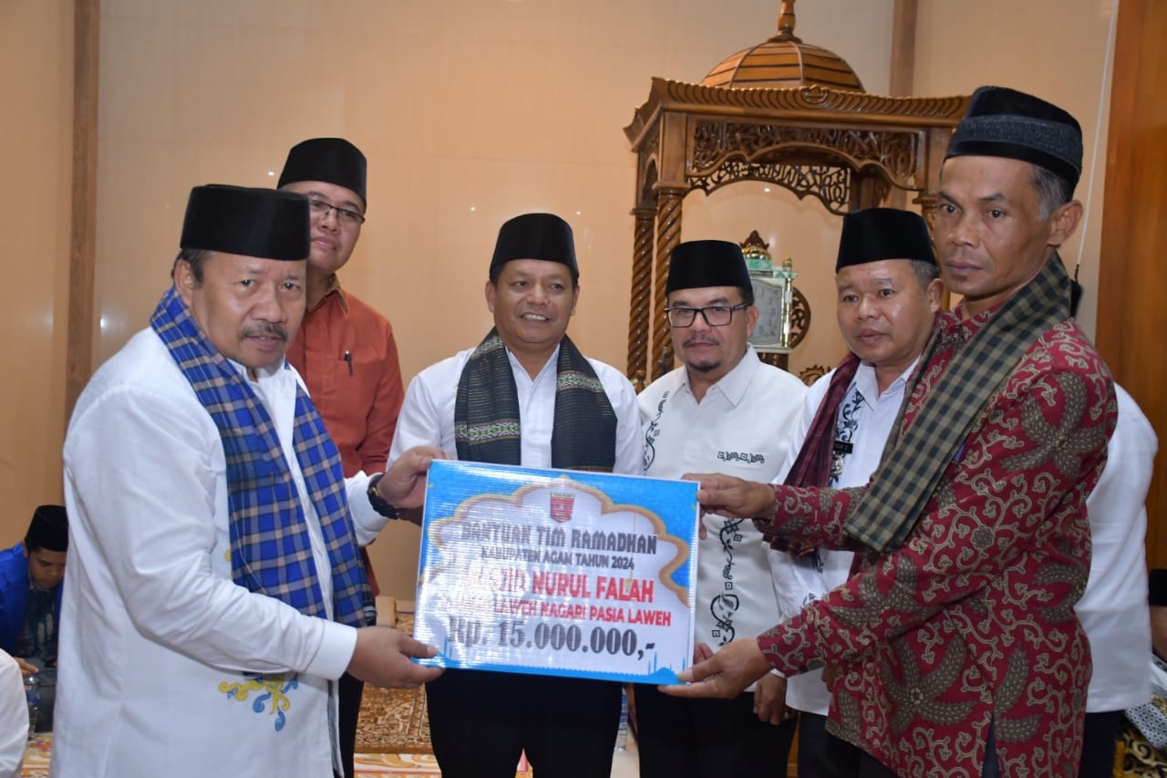 Bantuan diserahkan secara simbolis kepada pengurus Masjid Nurul Falah, dalam kunjungan Tim Khusus Safari Ramadan (TKSR) Kabupaten Agam.