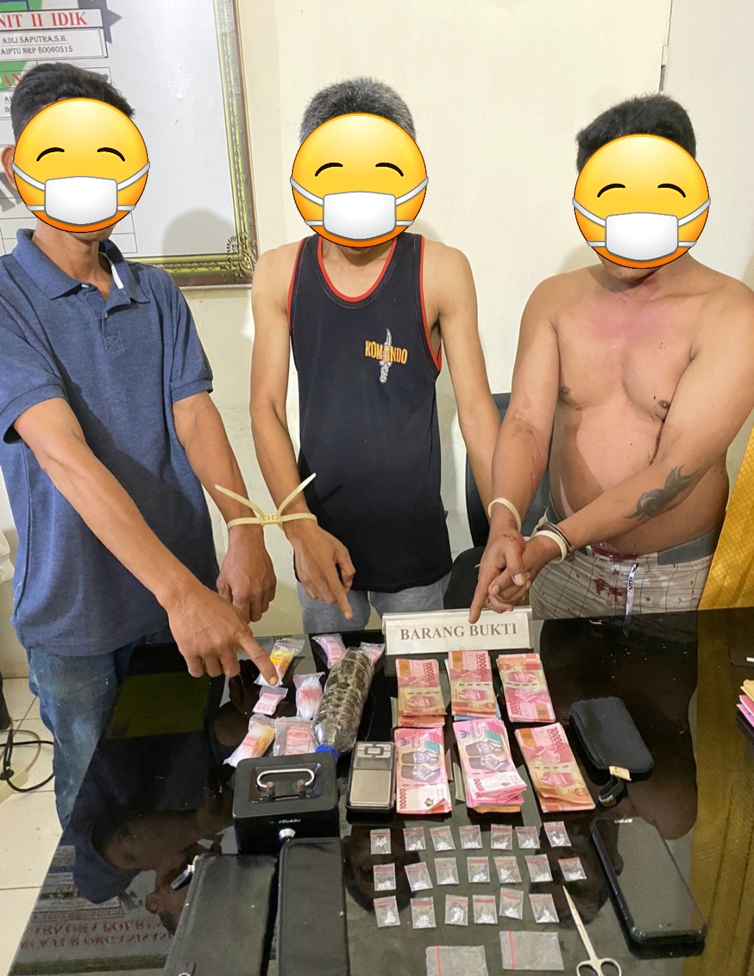 Dari tangan pelaku AES polisi berhasil mengamankan barang bukti berupa 2 (dua) paket sabu siap edar sebanyak 0,5 gram, 1 (satu) set alat hisap dan 1 (satu) unit handphone. Sedangkan dari pelaku SA, IL dan H petugas berhasil mengamankan barang bukti berupa 20 (dua puluh) paket sabu siap edar sebanyak 2,5 gram, 200 gram ganja kering, 1 (satu) unit timbangan digital, uang tunai hasil penjualan sabu senilai Rp. 5.952.000.00 (lima juta sembilan ratus lima puluh dua ribu rupiah), 1 (satu) set alat hisap dan 1 (satu) unit sepeda motor.