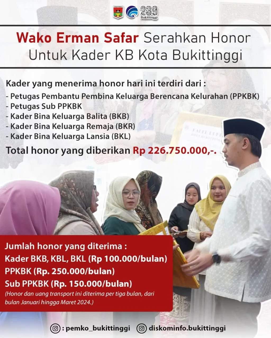 Marawapost.com, Bukittinggi – Pemko Bukittinggi melalui Dinas Pemberdayaan Perempuan Perlindungan Anak Pengendalian Penduduk dan Keluarga Berencana (DP3APPKB), berikan advokasi dan KIE Bangga Kencana serta honor kader KB. Kegiatan itu dilaksanakan di balairung rumah dinas wako, Rabu (27/03/24).