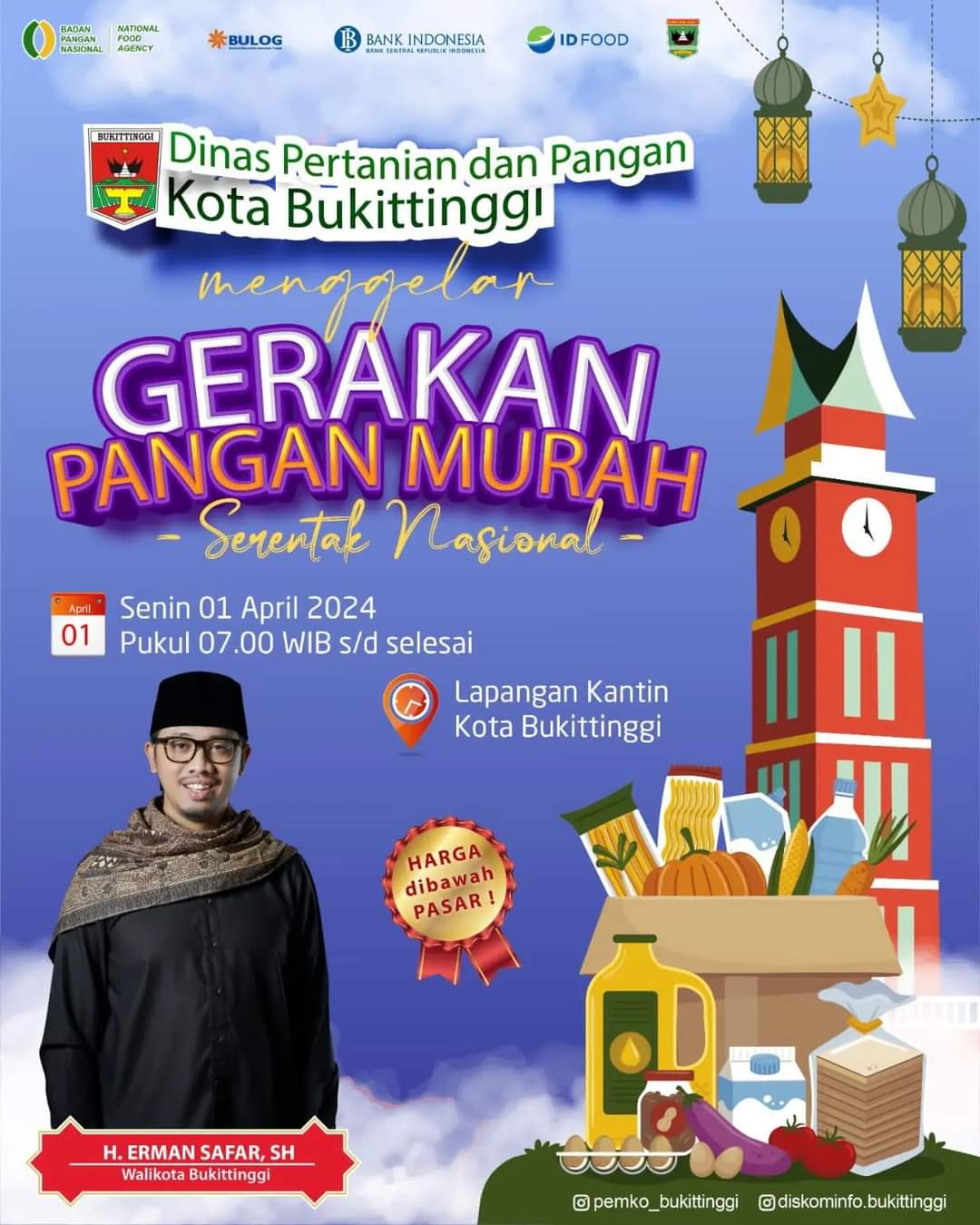 Marawapost.com, Bukittinggi – Pemerintah Kota Bukittinggi melalui Dinas Pertanian dan Pangan Kota Bukittinggi bakal gelar Gerakan Pangan Murah di Lapangan Kantin Kota Bukittinggi, Senin 01 April 2024 mendatang.