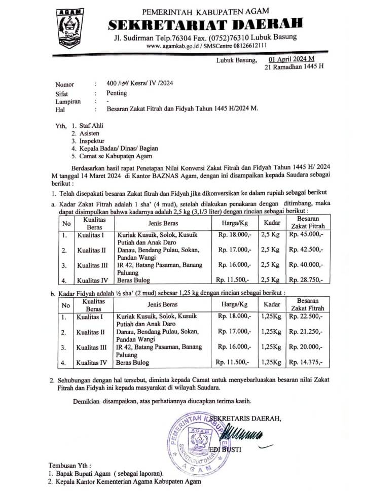 Besaran zakat itu tertuang dalam surat bernomor : 400/198/Kesra/IV/2024 Tnggal 1 April 2024 yang ditujukan kepada Staf Ahli, Asisten, Inspektur Kepala Badan/Dinas/Bagian serta Camat Se-Kabupaten Agam yang ditandatangani langsung oleh Ketua PHBI Drs Edi Busti M. Si agar diinformasikan kepada masyarakat secara luas.