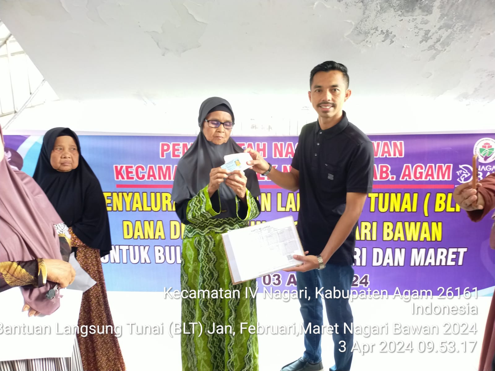 Walinagari Bawan Arif eka putra S.sn ketika dikonfirmasi media online marawapost.com,Rabu (03 /04/24) megatakan, Nagari Bawan telah sedang menyerahkan BLT kepada masyarakat penerimanya dan prosesnya sedang berjalan.