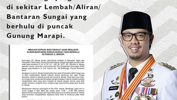 Marawapost.com, Bukittinggi – Walikota Bukittinggi himbau warganya agar menjauhi daerah di sekitar Lembah/Aliran/ Bantaran Sungai yang berhulu di puncak Gunung Marapi. Himbauan ini berdasarkan Kementerian ESDM untuk warga yang bermukim disekitaran gunung marapi, (06/04/24).
