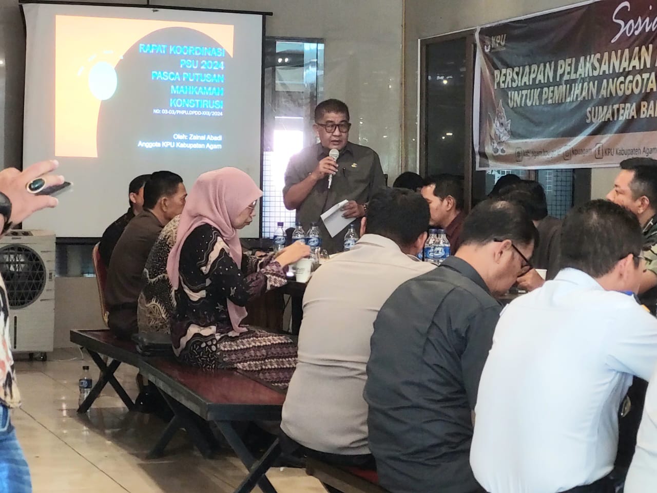 Marawapost.com, Agam – Mewakili Bupati Agam, Asisten Pemerintahan Dan Kesra, Rahman, SIP hadiri sosialisasi persiapan pelaksanaan Pemungutan Suara Ulang (PSU) untuk pemilihan anggota Dewan Perwakilan Daerah (DPD) Sumatera Barat di Hotel Sakura Syari’ah Lubuk Basung, Selasa (25/06/24). Kegiatan tersebut digelar oleh Komisi Pemilihan Umum (KPU) kabupaten Agam.
