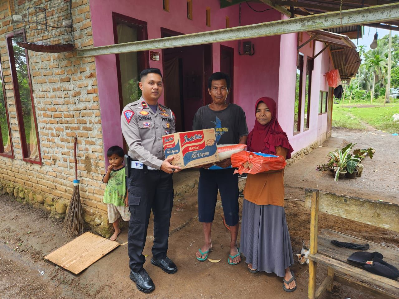 Disambung Kasatlantas, salah satu kegiatannya adalah pemberian bantuan sembako kepada Ririn, seorang ibu rumah tangga berusia 50 tahun, di Titisan Tunggang, Nagari Lubuk Basung, Kecamatan Lubuk Basung, Kabupaten Agam.