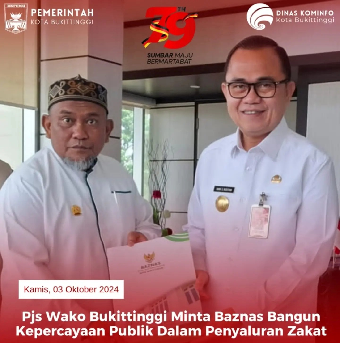 Marawapost.com, Bukittinggi – Pjs Wali Kota Bukittinggi, H. Hani S. Rustam terima audiensi dari Badan Amil Zakat Nasional (BAZNAS). Kegiatan berlangsung di ruang kerja Wali Kota Bukittinggi, Kamis, 3 Oktober 2024.