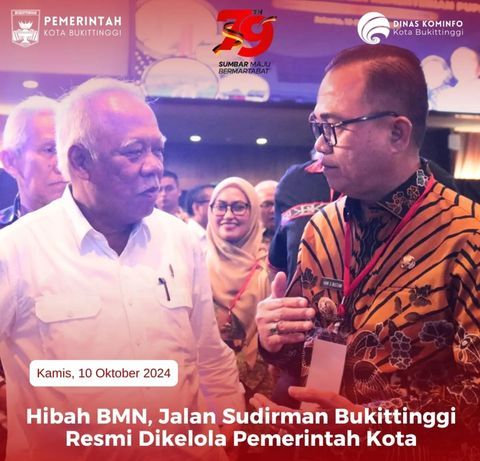 Pjs. Wali Kota Bukittinggi, H. Hani Syopiar Rustam, didampingi Kepala Dinas PUPR, Rahmat AE, menyampaikan, Pemerintah Kota Bukittinggi mengapresiasi Kementrian Pekerjaan Umum dan Perumahan Rakyat (PUPR) Republik Indonesia, atas hibah Barang Milik Negara (BMN) berupa jalan nasional pada Jalan Sudirman Kota Bukittinggi, untuk tahun perolehan 2009. Nilai perolehan dari hibah BMN ini berjumlah Rp 93.933.167.628,-.