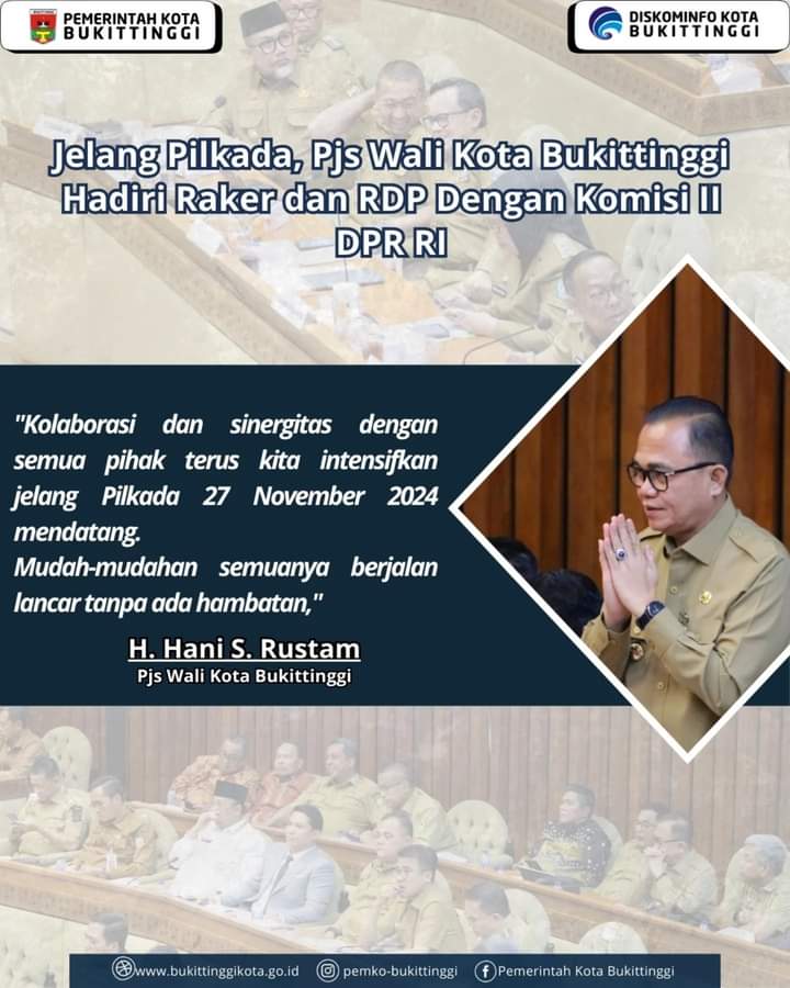 Pjs Wali Kota Bukittinggi, H. Hani S Rustam, menyampaikan, Pemerintah Kota Bukittinggi akan turut memperkuat sinergi antara pemerintah daerah dan pusat dan forkopimda, untuk kelancaran Pilkada Serentak tahun 2024 ini. Fokus utama lainnya adalah memastikan pelayanan publik, tetap berjalan optimal di tengah dinamika politik. Dalam setiap kesempatan, Hani S. Rustam, juga terus menegaskan pada seluruh ASN dan non ASN untuk menjaga netralitas dalam setiap tahapan pelaksanaan Pilkada Serentak 2024, dan juga mengimbau masyarakat untuk datang ke TPS memberikan hak pilihnya pada 27 November mendatang.