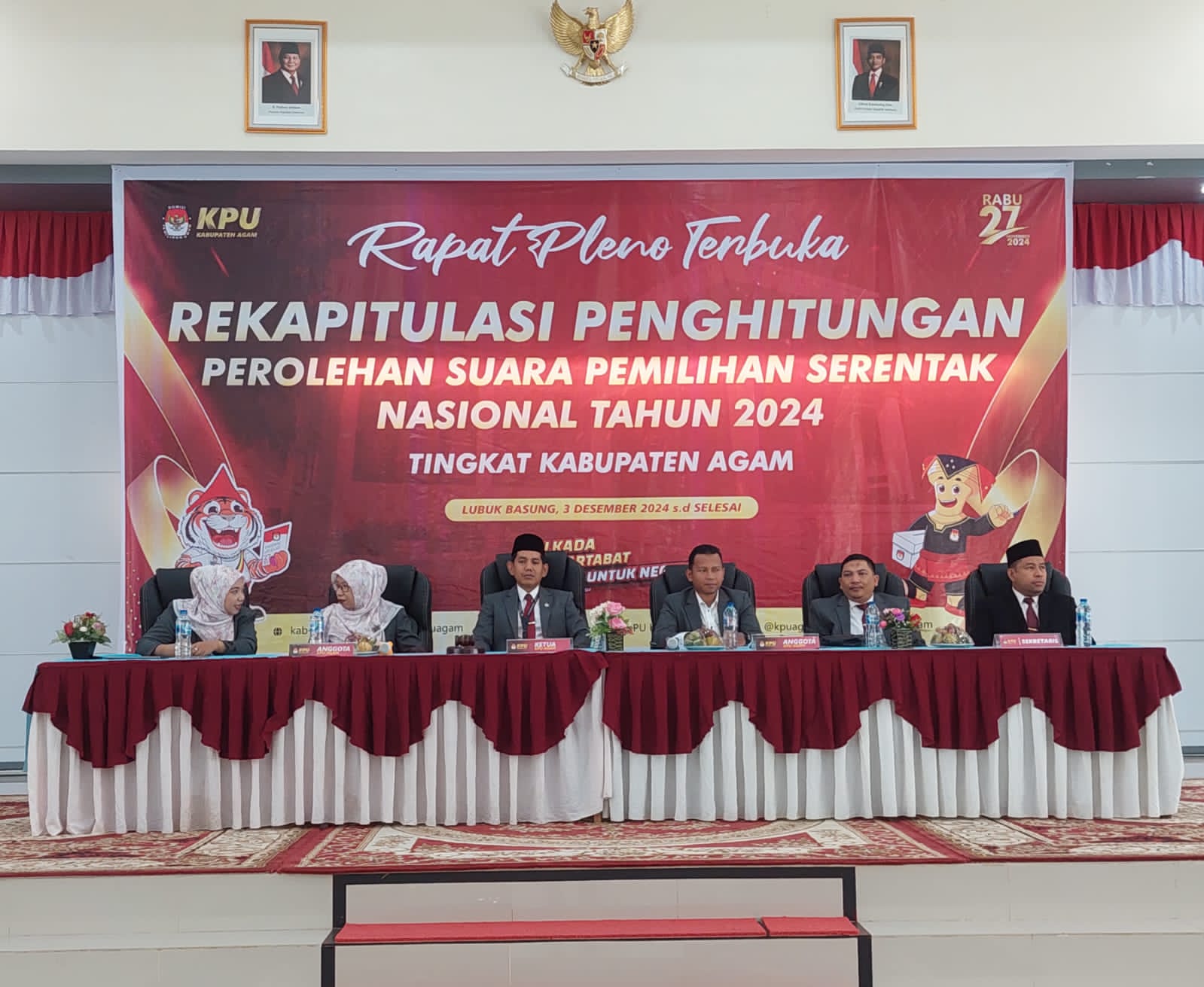Marawapost.com, Agam – Ketua Komisi Pemilhan Umum (KPU) Kabupaten Agam, Herman Susilo buka rapat pleno terbuka rekapitulasi penghitungan perolehan suara pemilihan serentak nasional tahun 2024 di balairung rumah dinas Bupati Agam, Selasa (03/12/24).