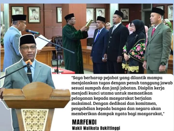 Wakil Wali Kota Bukittinggi, Marfendi, menyampaikan, hari ini telah dilaksanakan pelantikan pejabat administrator dan pengawas dilingkungan Pemerintah Kota Bukittinggi. Ini merupakan langkah penting dalam upaya memperkuat kinerja pemerintahan daerah. Dengan persetujuan dari Mendagri, Gubernur, dan ditandatangani oleh Wali Kota Bukittinggi, ini menunjukkan proses yang telah melalui berbagai tahapan sesuai aturan.