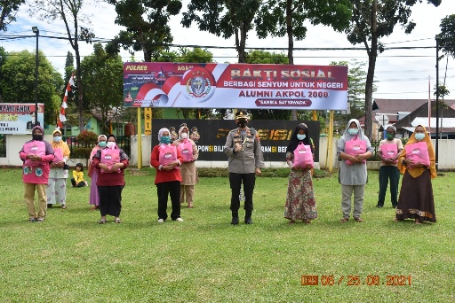 Agam, Marawa – Kapolres Agam, AKBP Dwi Nur Setiawan, S.I.K, MH Melaksankan Bantuan Sosial Dalam Rangka Bakti Sosial Berbagi Senyum Untuk Negeri Alumni Akpol Th. 2000 yang bertempat di halaman depan Polres Agam dan daerah seputaran Lubuk Basung, Rabu (25/08/21).