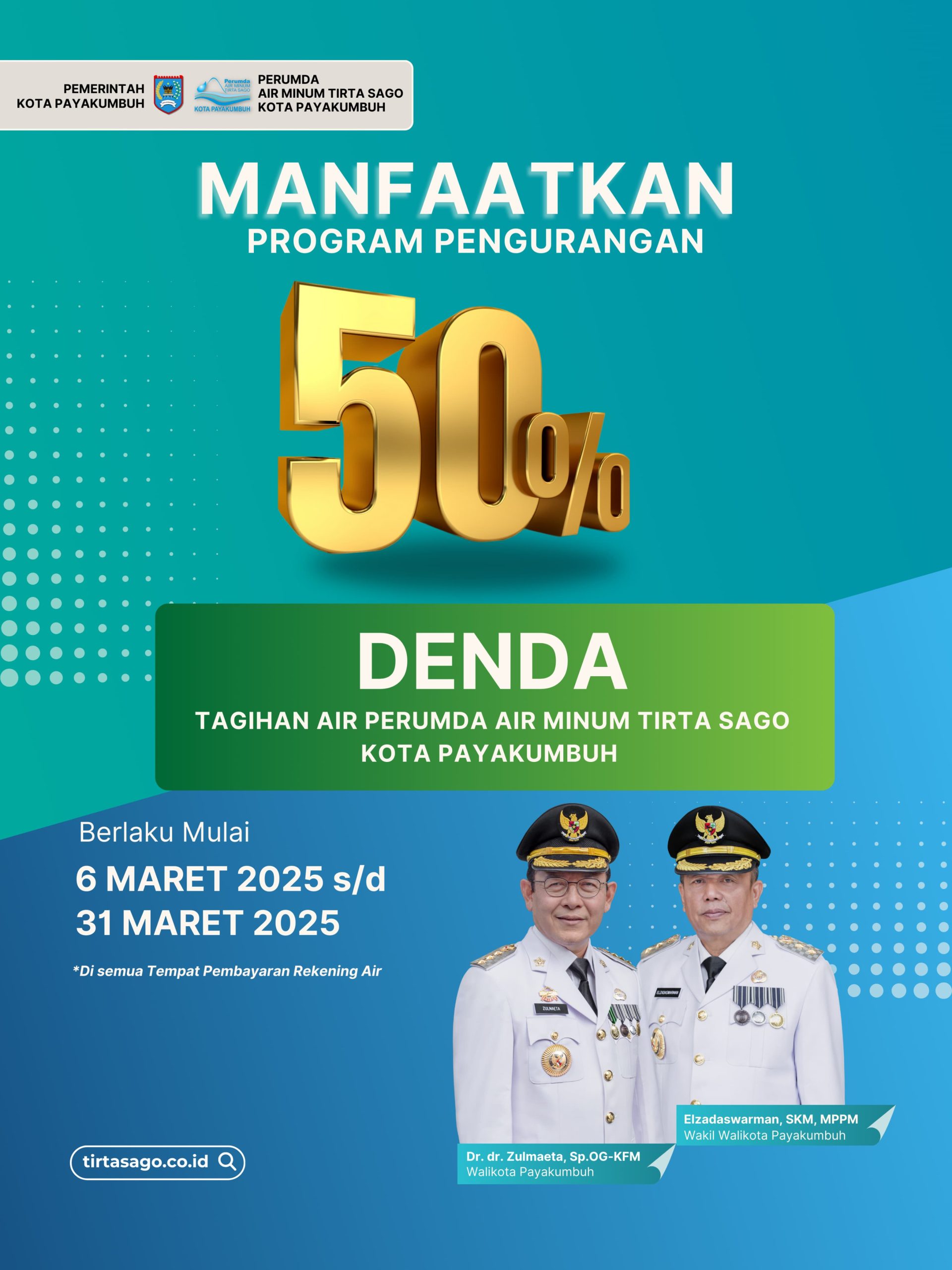 Marawapost.com, Payakumbuh – Perumda Air Minum Tirta Sago (Pamtigo) Kota Payakumbuh menghadirkan program keringanan denda keterlambatan pembayaran hingga 50 persen yang berlaku dari 6 Maret hingga 31 Maret 2025.