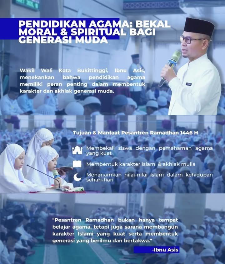 Dalam sambutannya, Wakil Wali Kota Bukittinggi, Ibnu Asis, menekankan pentingnya pendidikan agama bagi generasi muda sebagai bekal moral dan spiritual dalam menghadapi tantangan zaman. Pesantren Ramadan mengajarkan disiplin dan nilai-nilai Islam melalui berbagai aktivitas terstruktur. Seiring perkembangan zaman, pesantren tidak hanya menjadi tempat pendidikan agama, tetapi juga sarana penyampaian pesan kebaikan yang relevan dengan kondisi saat ini.