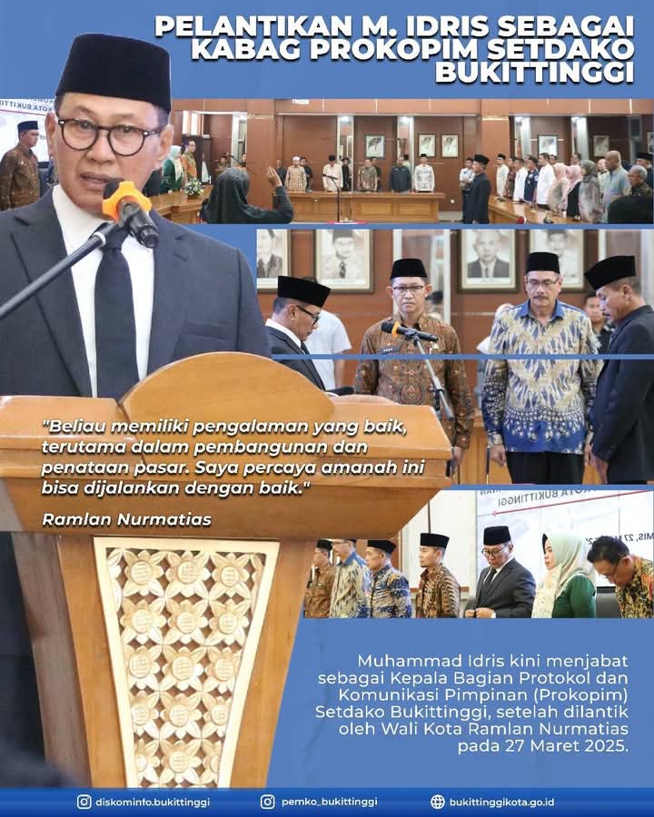 Marawapost.com, Bukittinggi – Muhammad Idris dilantik sebagai Kepala Bagian Protokol dan Komunikasi Pimpinan (Prokopim) Setdako Bukittinggi. Mantan Kepala dinas pasar itu, dilantik langsung oleh Wali Kota Bukittinggi, Kamis, 27 Maret 2025.