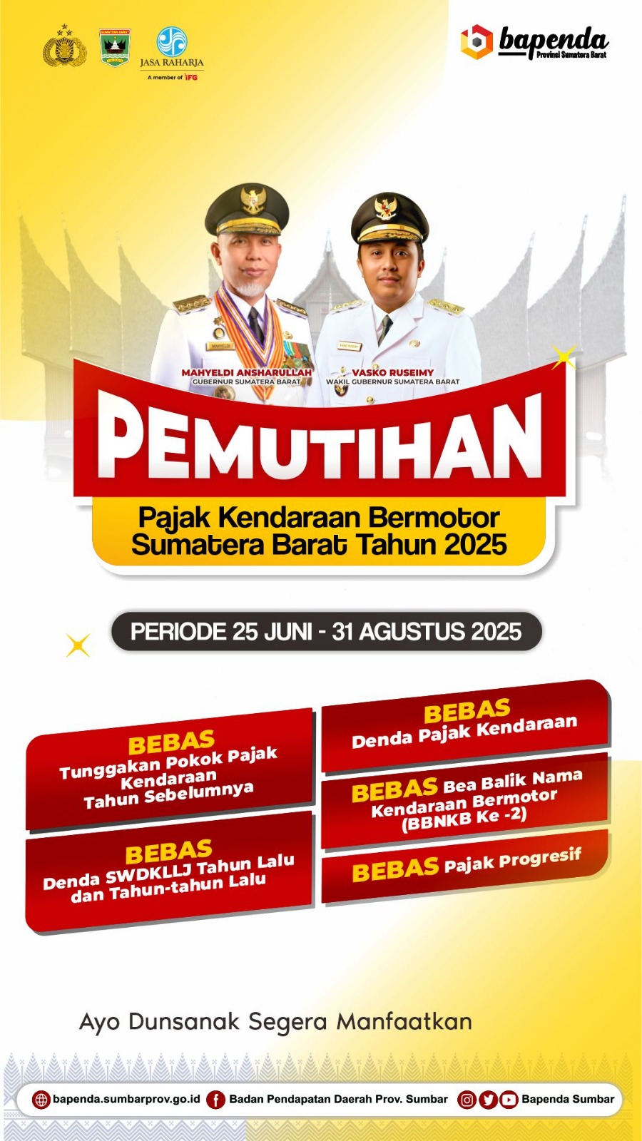 Gubernur Sumatera Barat, Buya Mahyeldi Ansharullah menghimbau kepada selurh pengguna dan pemilik kendaraan bermotor di Sumatera Barat untuk memanfaatkan program pemutihan pajak kendaraan bermotor.
