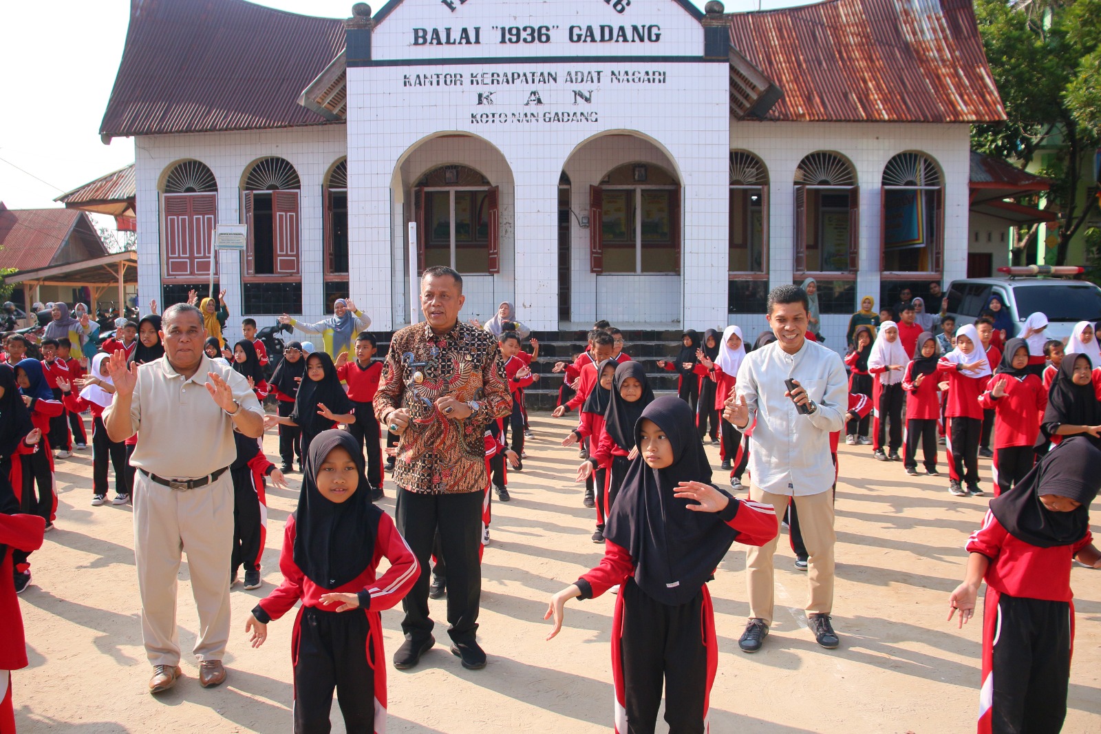 Sebelum peluncuran, seluruh rombongan dan siswa SD N 1 Payakumbuh mengikuti senam Tujuh Kebiasaan Sehat Anak Indonesia.