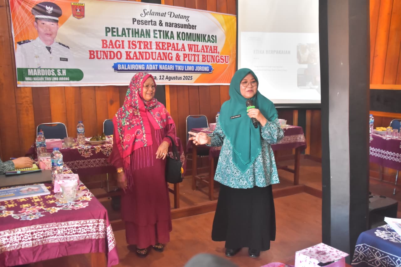 Marawapost.com, Agam – Ketua Tim Penggerak PKK Kabupaten Agam, Ny. Merry Benni Warlis, menjadi narasumber pada Pelatihan Etika Komunikasi bagi Istri Kepala Wilayah, Bundo Kanduang, dan Puti Bungsu di Balairung Adat Nagari Tiku V Jorong, Kecamatan Tanjung Mutiara, Selasa (12/08/25).