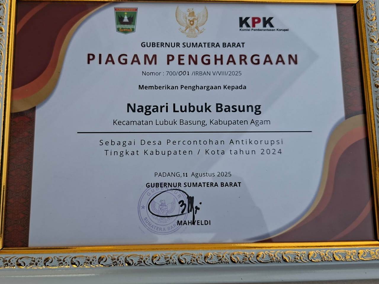 Perhargaan yang kedua yaitu, Nagari Lubuk Basung raih Piagam Penghargaan sebagai Desa Percontohan Antikorupsi Tingkat Kabupaten/Kota tahun 2024 yang diserahkan oleh Gubernur Sumatera Barat.