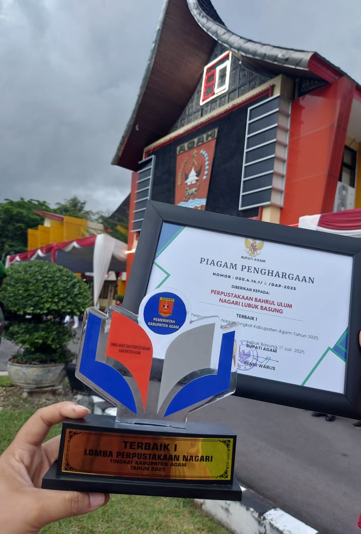 Penghargaan pertama yaitu, Perpustakaan Bahrul Ulum Nagari Lubuk Basung meraih Piagam Penghargaan sebagai Perpustakaan Terbaik 1 Tingkat Kabupaten Agam Tahun 2025. Piagam diserahkan langsung oleh Bupati Agam setelah upacara peringatan HUT RI ke-80.