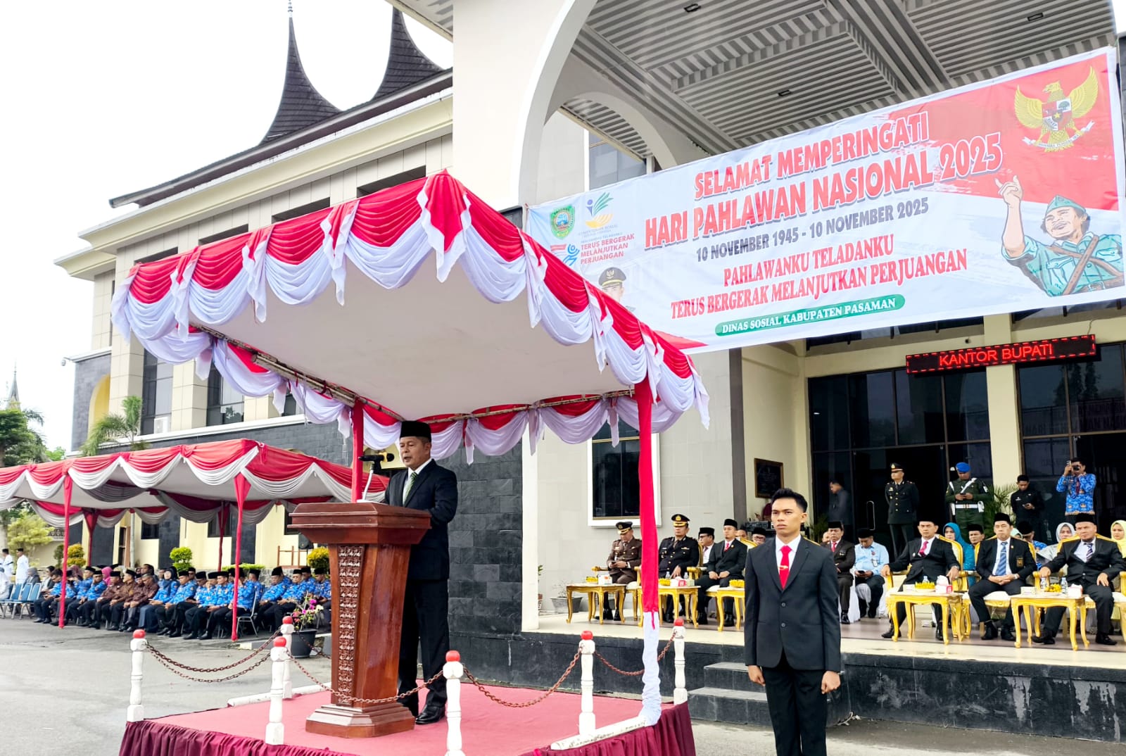 Peringatan Hari Pahlawan tahun 2025 di Kabupaten Pasaman digelar dengan upacara khidmat di halaman Kantor Bupati Pasaman, Lubuk Sikaping, pada Senin (10/11/2025). Upacara dipimpin langsung oleh Bupati Pasaman, Welly Suhery, dan dihadiri oleh Wakil Bupati, unsur Forkopimda, Sekda, kepala OPD, ASN, instansi vertikal, BUMN, BUMD, TNI/Polri, pelajar, mahasiswa, veteran, dan tokoh masyarakat.