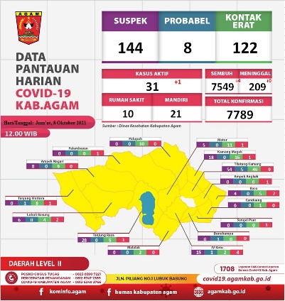Agam, Marawa – Jumlah warga yang dinyatakan terkonfirmasi Covid-19 di Kabupaten Agam bertambah sebanyak 1 kasus. Jumat (8/10) ini, total kumulatif kasus terkonfirmasi Covid-19 di daerah itu mencapai 7.789 orang