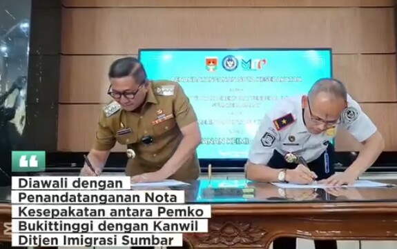 Marawapost.com, Bukittinggi – Pemerintah Kota Bukittinggi bersama Kantor Wilayah Direktorat Jenderal Imigrasi Sumatra Barat tandatangani kesepakatan dan Perjanjian Kerja Sama tentang layanan keimigrasian. Penandatanganan ini berlangsung di ruang tamu Kantor Wali Kota, Senin (12/01/26).