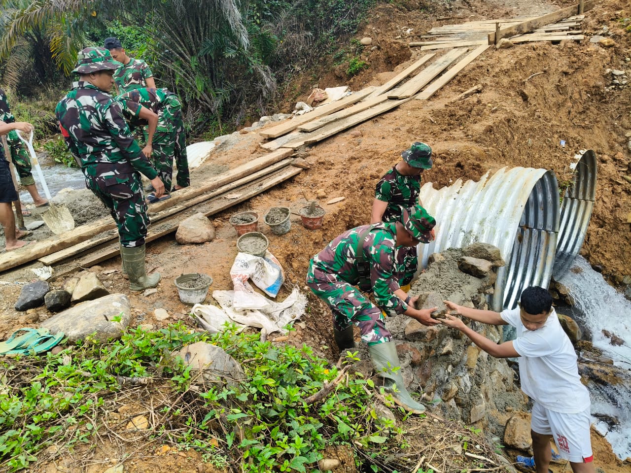 Sebanyak 24 personel gabungan dari unsur TNI diterjunkan langsung di lokasi. Mereka terdiri dari personel Denzipur 2/PS, Yon TP 897/SGL, serta Babinsa Koramil 07/Air Bangis Kodim 0305/Pasaman. Kehadiran personel ini menjadi ujung tombak percepatan pembangunan infrastruktur yang sangat dibutuhkan masyarakat setempat.
