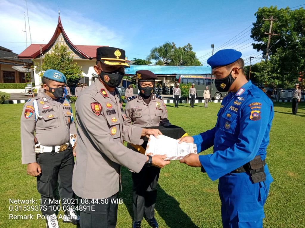 Agam, Marawa – Kepolisian Resort (Polres) Agam laksanakan upacara bulanan sekaligus penyerahan piagam penghargaan kepada Bripka Ronny Marsyal, SH yang merupakan personil Satpolaair Polres Agam di halaman mako Polres Agam, Rabu (17/03/21).