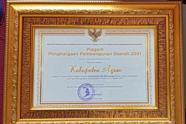 Agam, Marawa – Mengakhiri tahun 2021, Kabupaten Agam meraih piagam Penghargaan Pembangungan Daerah (PPD) 2021 dari Kementerian Perencanaan dan Pembangunan Nasional (PPN)/Badan Perencanaan Pembangunan Nasional (Bappenas).