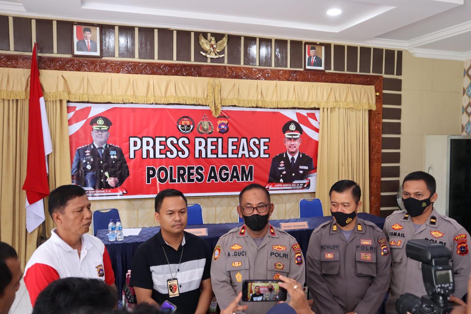 Waka Polres Agam Kompol Adrizal Guci didampingi Kasat Reskrim AKP RJ. Agung Pratomo, Kasubag Dal Ops AKP Reza Fahlepi, Plt Kasi Humas Ipda Ismail saat memimpin kegiatan Press Release di Aula Wibisono Polres Agam, Jumat, (5/8/22) menuturkan, “Selama operasi pekat yang digelar sejak tanggal 13-26 Juli 2022, kita telah berhasil mengungkap tiga kasus, dua kasus perjudian toto gelap (togel) dan satu kasus peredaran dan perdagangan Minuman Keras (Miras) tanpa izin yang syah”.