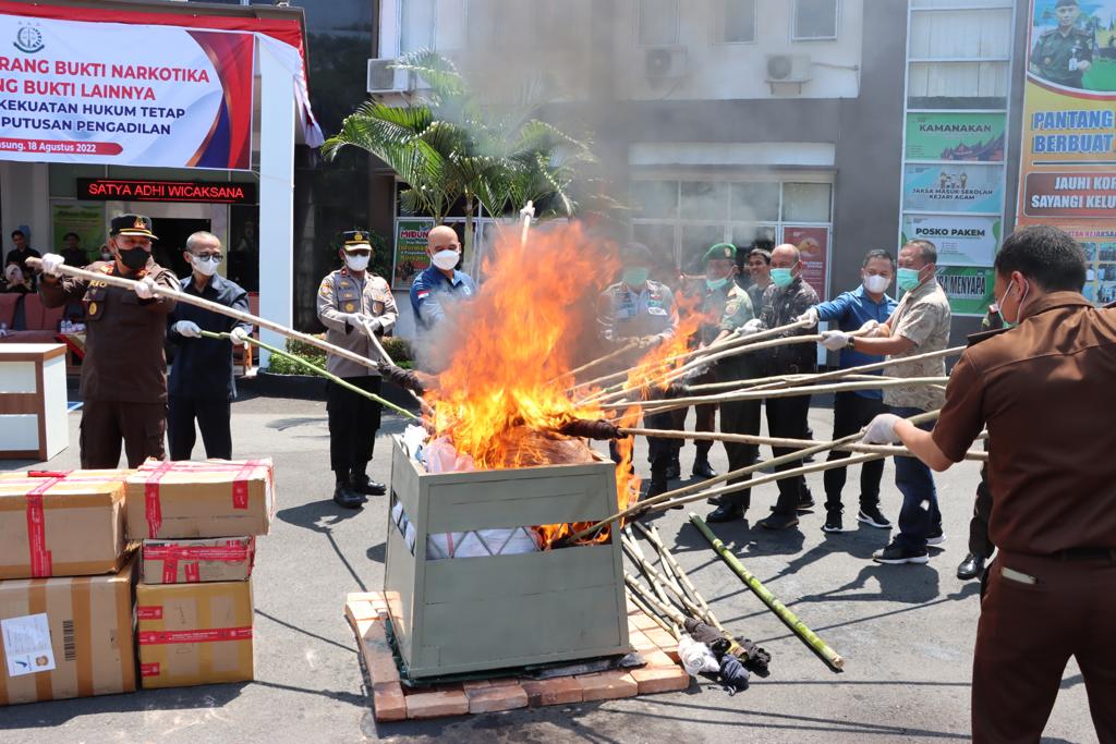 Dari perkara undang – undang penyalahgunaan Narkotika Barang Bukti yang dimusnahkan terdiri dari Sabu – sabu sebanyak 42,98 Gram dan Ganja Kering sebanyak 7,8 Kilogram, dari perkara tindak pidana perjudian barang bukti yang dimusnahkan berupa buku tafsir, buku yang berisikan angka – angka togel, alat tulis, alat komunikasi berupa handphone yang digunakan untuk bermain togel secara Online, sedangkan terhadap perkara tindak pidana cabul barang bukti yang dimusnahkan berupa pakain.