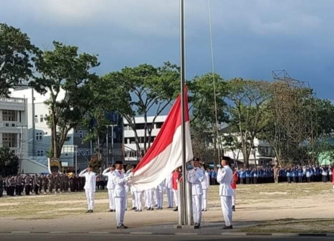 Bukittinggi, Marawa – Wakil Wali Kota Bukittinggi, Marfendi bertindak sebagai inspektur upacara penurunan bendera di Lapangan Wirabraja, Rabu (17/08) sore. Pada kegiatan itu, 54 Anggota Tim Nusa Paskibraka Bukittinggi sukses turunkan Bendera Sang Pusaka Merah Putih.