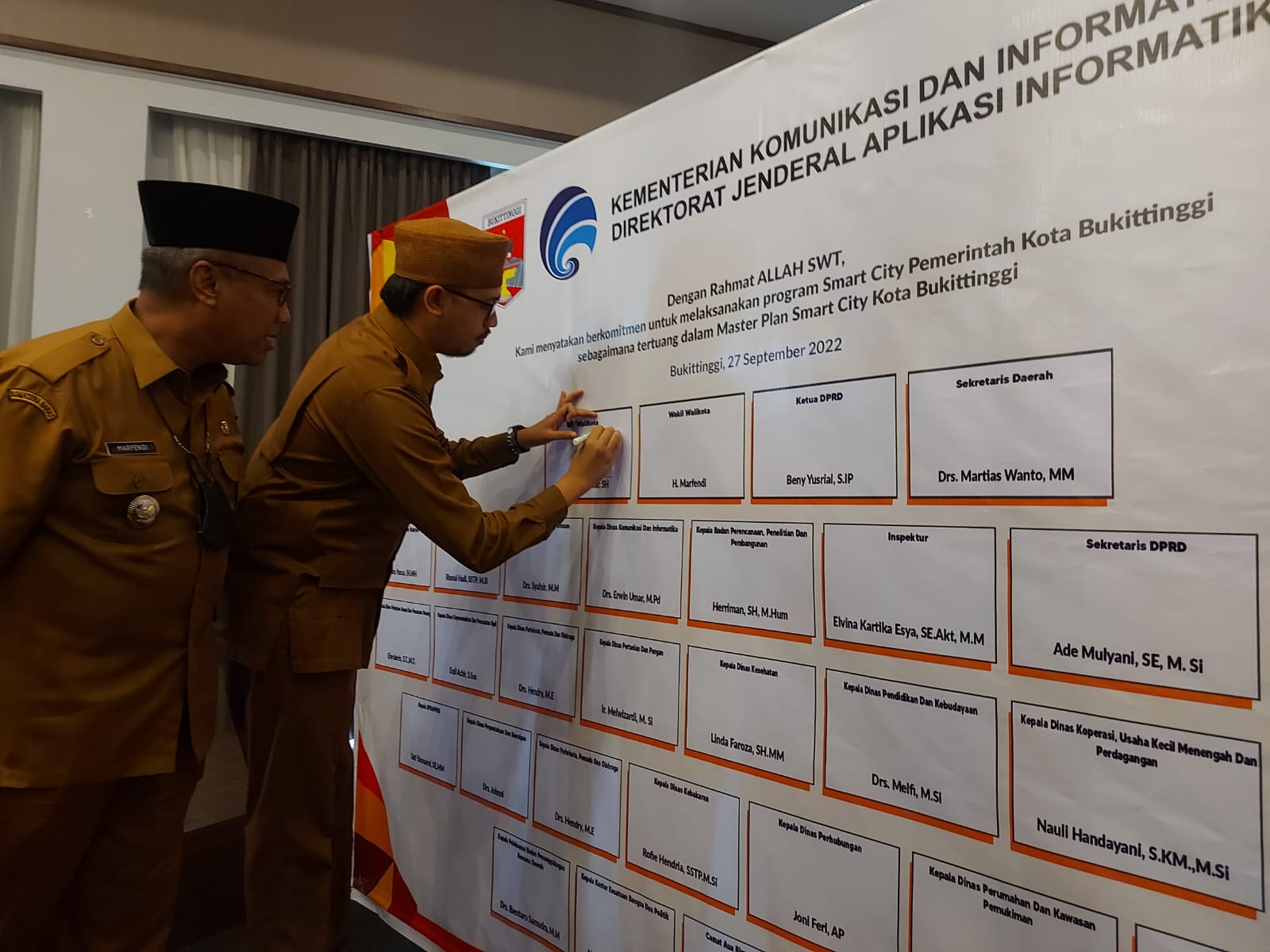 Bukittinggi, Marawa – Pemerintah Kota Bukittinggi secara resmi tandatangani komitmen program smart city. Penandatanganan dilakukan Wali Kota, Wakil Wali Kota, Ketua DPRD dan seluruh Kepala SKPD, di Hotel Balcone, Selasa (27/09).